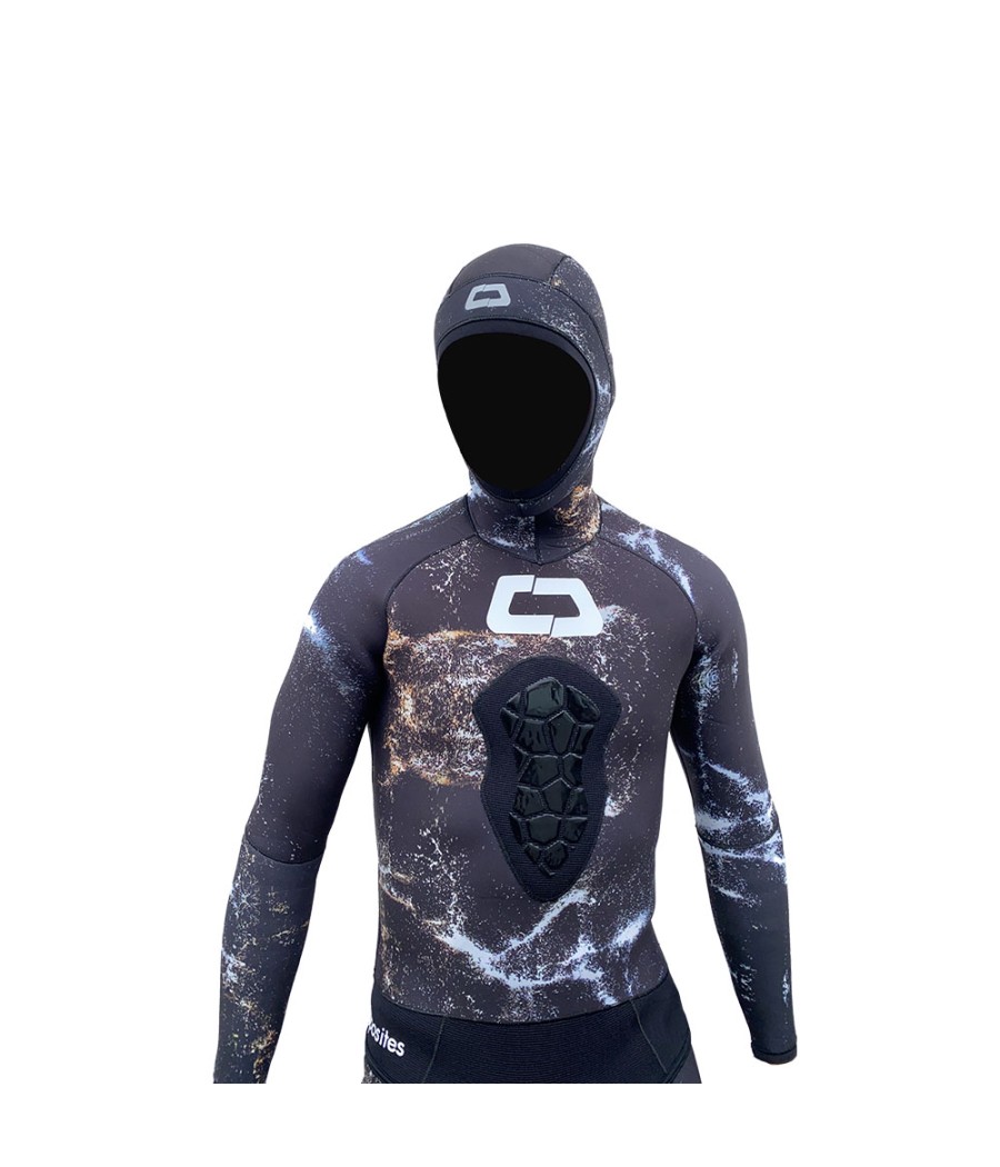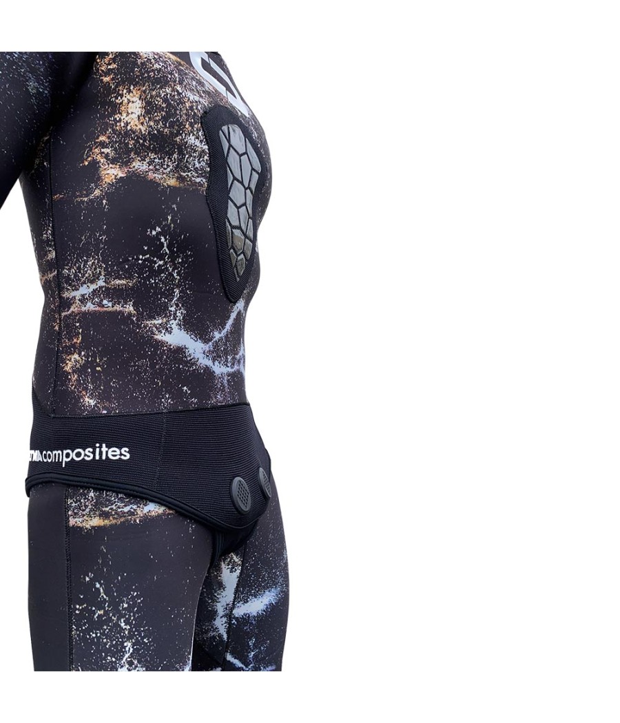 La nuovissima muta due pezzi realizzata in foderato spaccato da 3/5 mm in neoprene notevolmente elastico con una vestibilità mai vista prima. Il nuovo camouflage con sfondo nero rappresenta la zona d’ombra delle rocce, mentre le venature costruiscono il fondale roccioso e sabbioso. Questo mimetizza al meglio il pescatore subacqueo nel 90% di qualsiasi situazione ambientale. Il pantalone a vita alta con rinforzi sulle ginocchia e una giacca con carico sternale che aiuta il pescatore a ridurre notevolmente il dolore sul petto durante il caricamento del fucile.