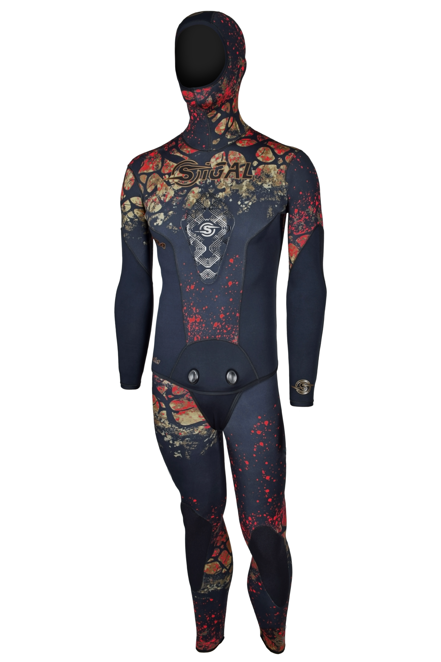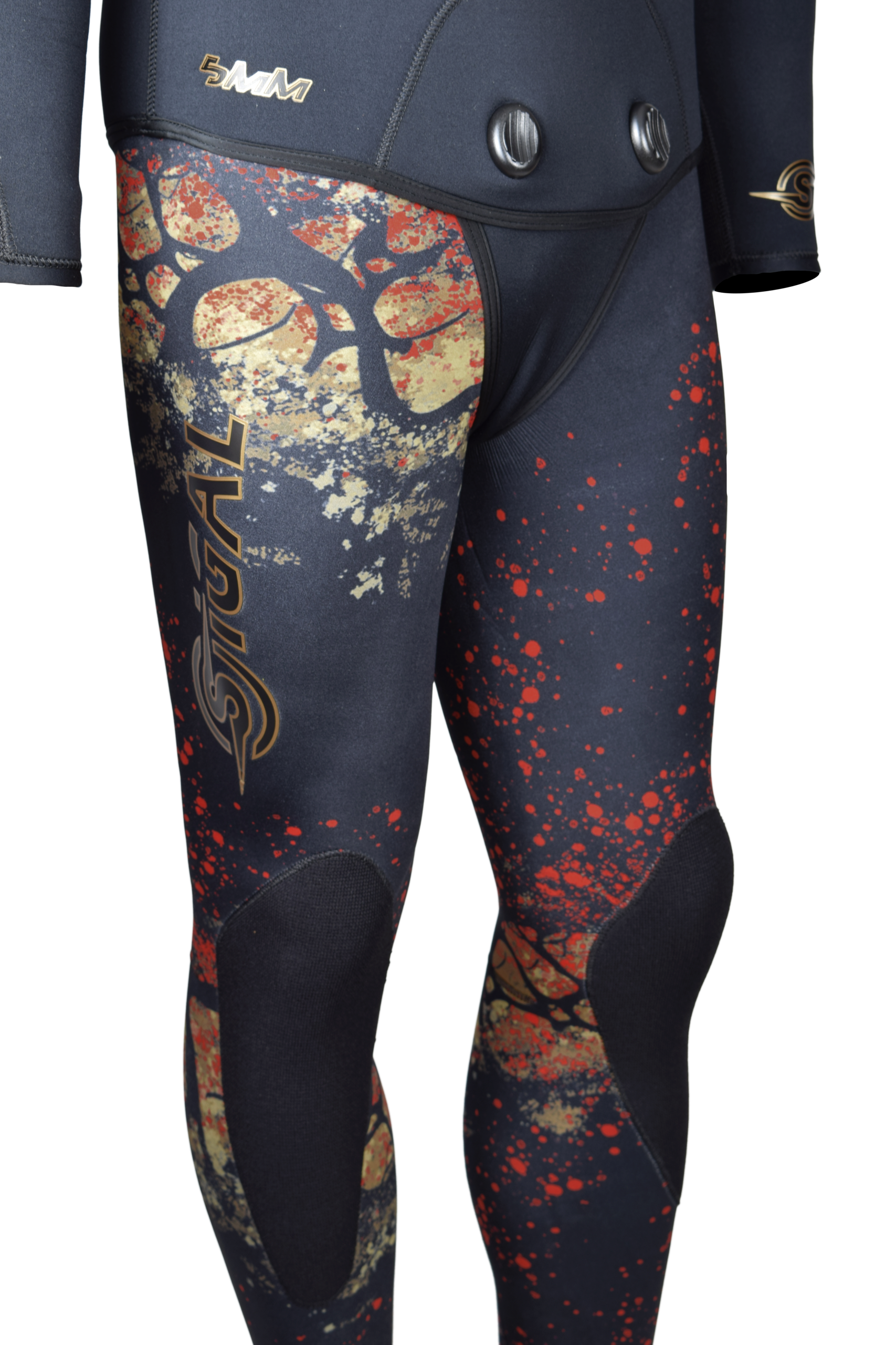 Mute due pezzi ideate per la pesca subacquea, realizzate in neoprene macrocellulare spaccato interno e fodera elastica mimetica esterna.